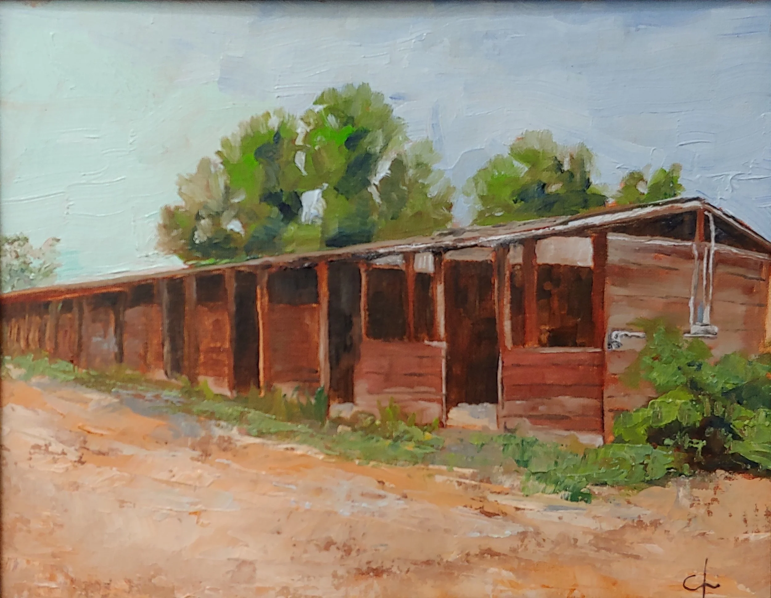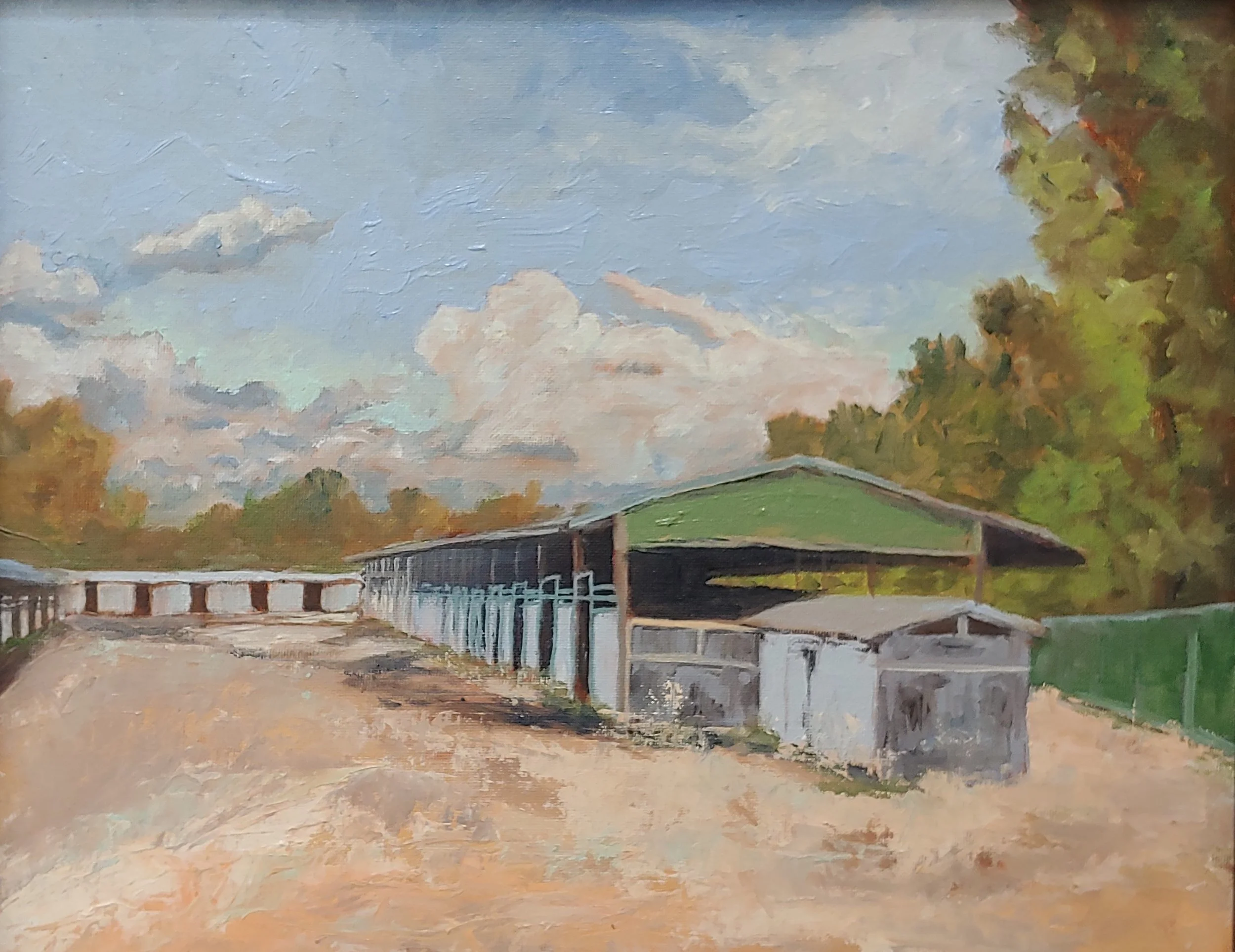 I am painting the stables at Les Bois race Track before they are bulldozed and disappear to memory. All of these paintings are Plein Air then finished in the studio. I am painting the different styles of stables as the changed over the decades.